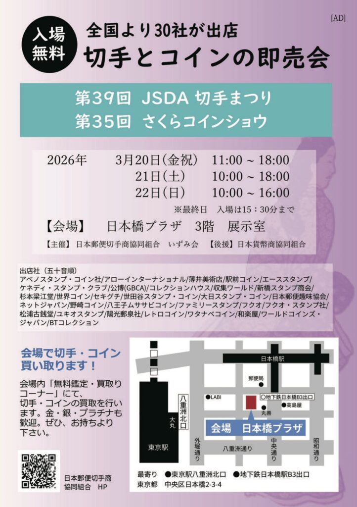 スタンペックスジャパン2026にご協力頂いている、全国切手商協同組合 様が本日より日本橋で開催するJSDA春の切手まつりにて、スタンペックスジャパン2026 の公式ガイドとチケットの無料配布を行います。ご近隣の方は、どうぞお越しください。